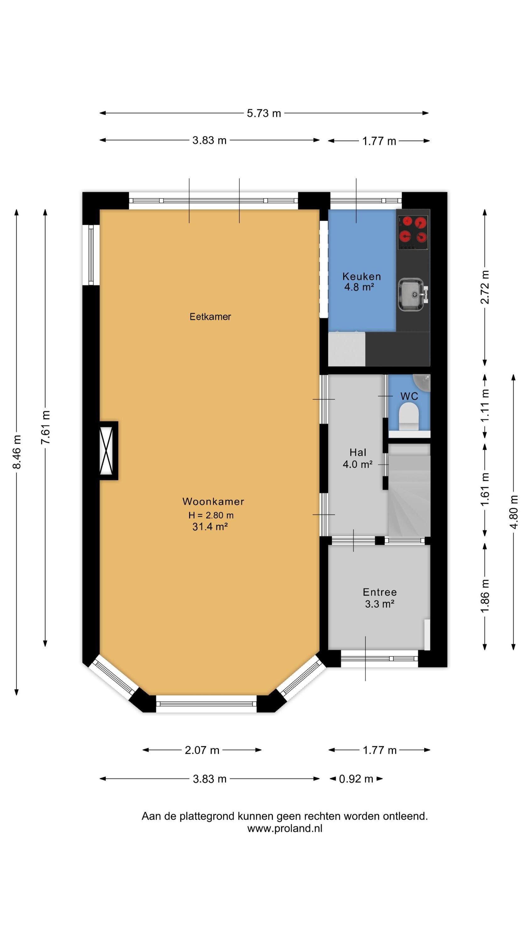 - 121 m² (11.5 meter diep en 10.5 meter breed)